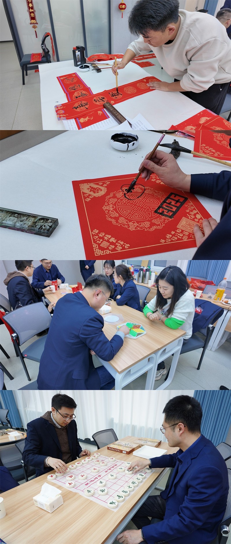 棋牌類游戲區(qū),博弈雙方凝神屏氣、見招拆招、運籌帷幄、樂在“棋”中。春聯(lián)福字區(qū),長桌排開、翰墨飄香,喜迎新春的氣氛撲面而來。一聲聲叫好、一副副春聯(lián)、一個個“?!弊?,承載著大家對新年的美好期盼與祝福。