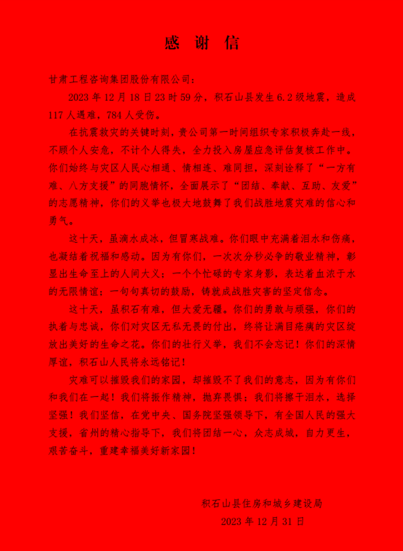 1月3日上午,積石山縣住房和城鄉(xiāng)建設(shè)局向甘肅工程咨詢集團(tuán)贈(zèng)送“為百姓不懼艱險(xiǎn),戰(zhàn)險(xiǎn)情奮勇爭先”錦旗,并發(fā)來《感謝信》,對在抗震救災(zāi)關(guān)鍵時(shí)刻奔赴災(zāi)區(qū)開展房屋應(yīng)急評估工作的專家表達(dá)感謝和敬意。