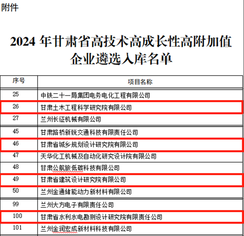 近日,甘肅省科技廳公布2024年甘肅省高技術(shù)高成長(zhǎng)性高附加值(簡(jiǎn)稱“三高”)企業(yè)名單,甘肅工程咨詢集團(tuán)旗下省建筑設(shè)計(jì)院、省水電設(shè)計(jì)院、省城鄉(xiāng)規(guī)劃院、甘肅土木工程院從眾多企業(yè)中脫穎而出,成功登上全省首批“三高”企業(yè)榜單。