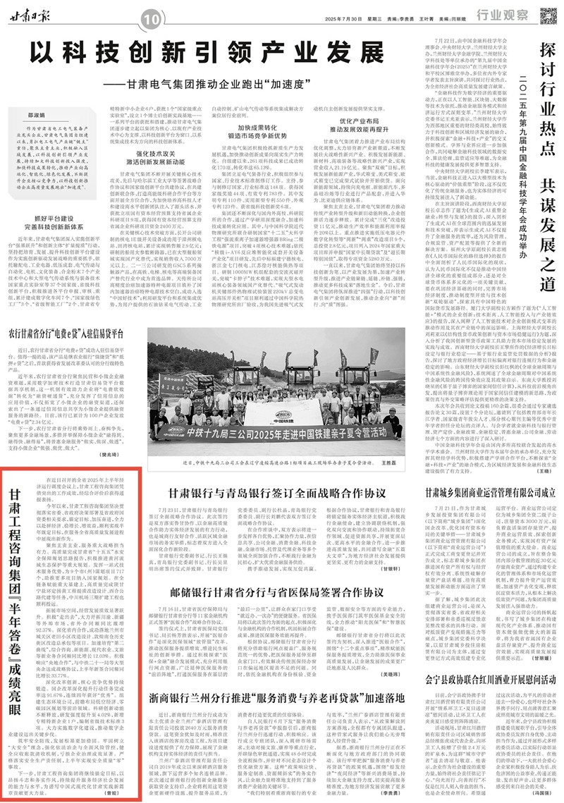 拓展市場(chǎng)空間,經(jīng)營(yíng)發(fā)展質(zhì)效顯著躍升。積極“走出去”,大力開拓川渝、新疆等外埠市場(chǎng),省外合同額同比激增92.37%。深化省內(nèi)合作,成功落地蘭州市城關(guān)區(qū)老舊小區(qū)改造設(shè)計(jì)、敦煌南倉歷史街區(qū)改造總承包等項(xiàng)目。加速培育“第二曲線”,綜合咨詢、新能源、現(xiàn)代農(nóng)業(yè)、文旅等新業(yè)務(wù)合同額同比增長(zhǎng)12.03%。積極響應(yīng)“央地合作”,與中鐵二十一局等大型央企達(dá)成戰(zhàn)略協(xié)議,上半年新簽合同額同比增長(zhǎng)33.77%。