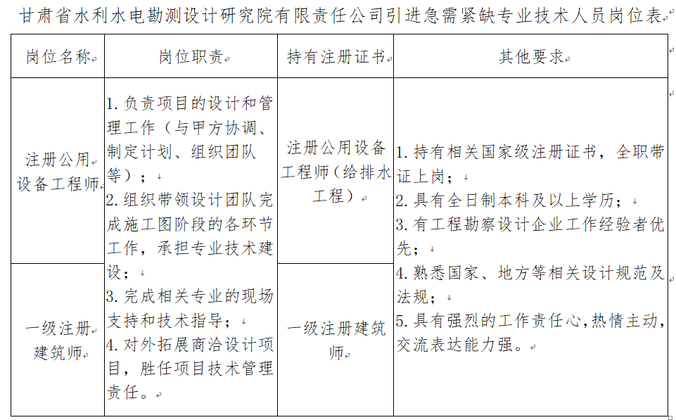 本次引進的具體崗位及資格條件詳見《甘肅省水利水電勘測設(shè)計研究院有限責任公司引進急需緊缺專業(yè)技術(shù)人員崗位表》(附件1)。