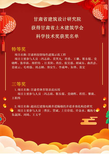 近日,從甘肅省土木建筑學會傳來好消息,建筑設計院選送的“甘肅科技館綠色建筑示范工程”“甘肅省體育館表皮應用”“超高層建筑電梯井道隔墻的井道多效化構造研究”等項目被該學會分別授予科學技術獎特等獎和三等獎。