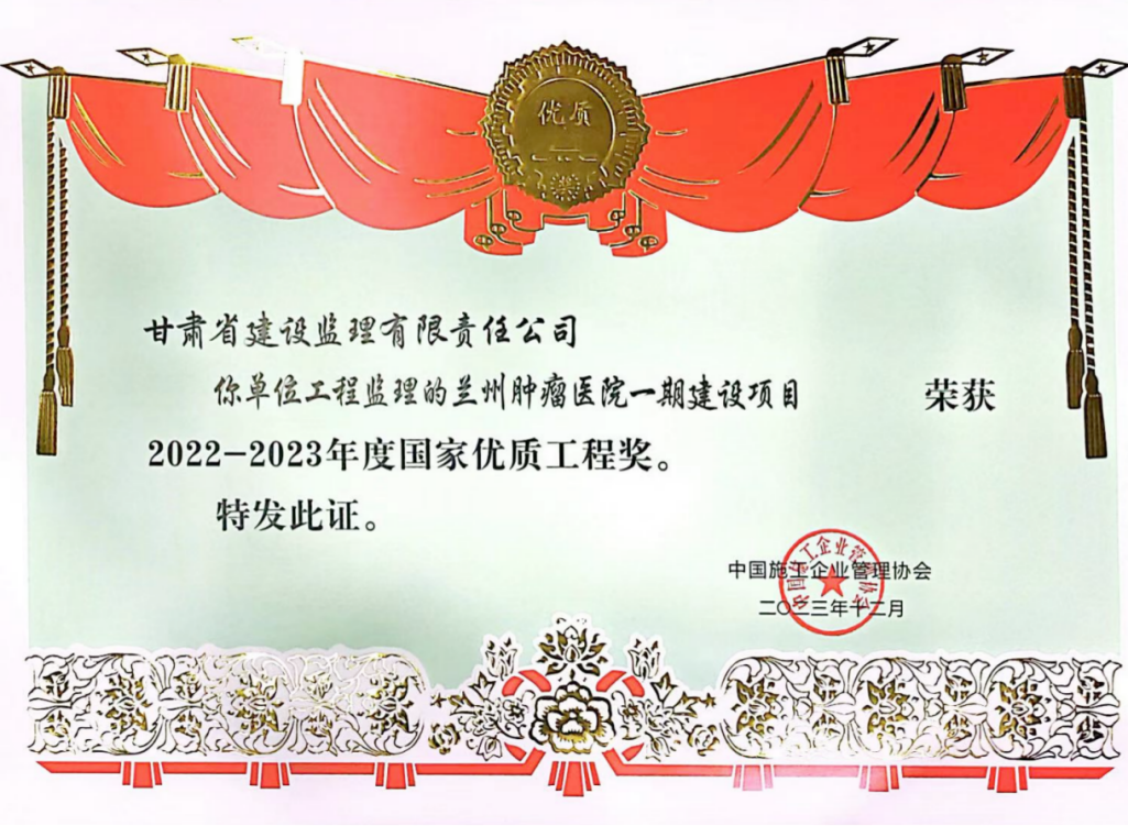 近日,經(jīng)中國施工企業(yè)管理協(xié)會評審,省建設(shè)監(jiān)理公司監(jiān)理的蘭州腫瘤醫(yī)院一期建設(shè)項目榮獲2022-2023年度國家優(yōu)質(zhì)工程獎。此前,該項目已先后榮獲甘肅省建設(shè)工程文明工地、2021-2022年度甘肅省建設(shè)工程飛天獎、2022-2023年度國家優(yōu)質(zhì)工程獎。